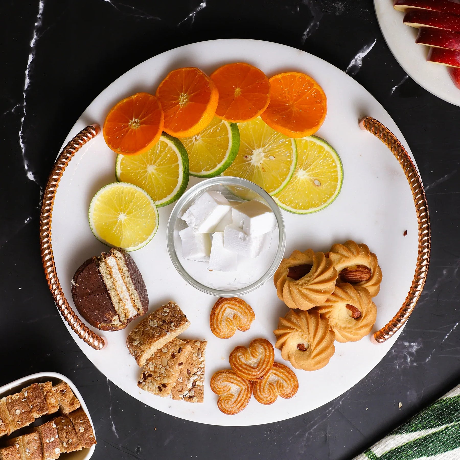 Consider our marble 3 tier serving tray, it's a masterpiece of marble artistry. It features intricate handwork in metal detailing and is perfect for serving cakes, snacks and more. Our marble platters and trays alike showcase beautiful patterns and geometry that instantly make everyone a fan of your thoughtful choices.